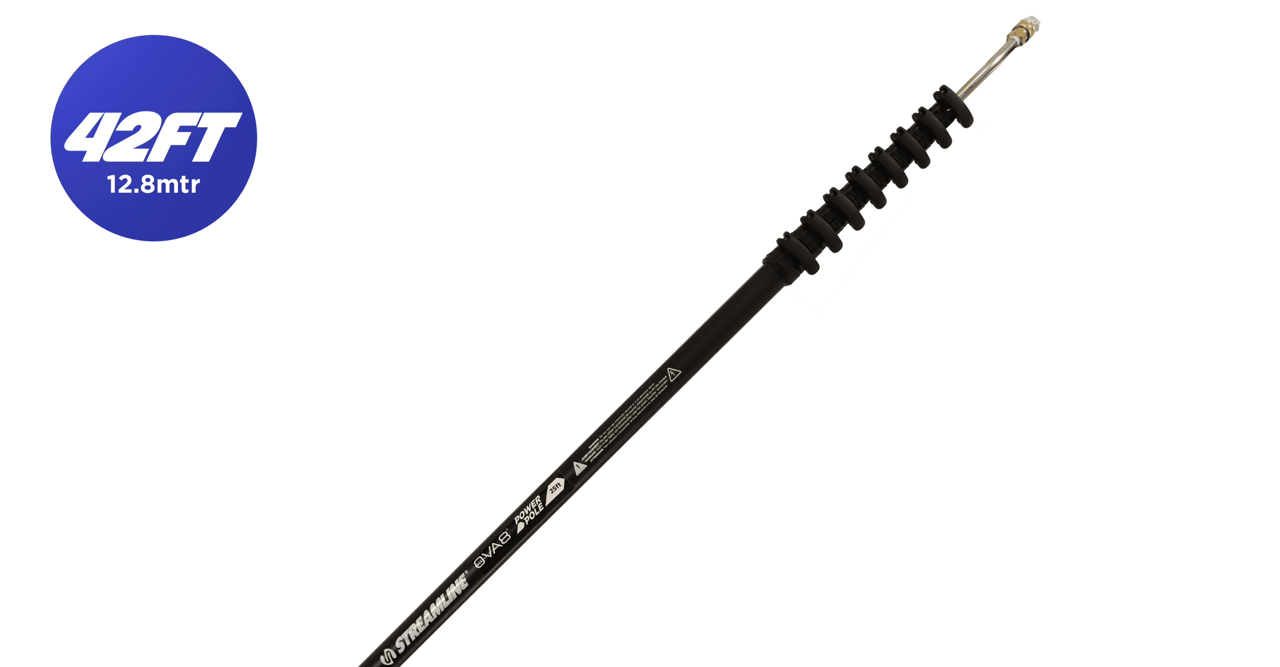 42ft OVA8® power pole A unique high pressure configuration for the OVA8® Poles but for high pressure cleaning, enabling users to clean up 42ft with 4000psi/276bar. And because of the anti-spin pole section on the OVA8® pole, the oval shaped clamps work less due to only having to prevent the pole sections from moving up or down. The pole offers more rigidity and better control, as the two flat sides sits more comfortably in an operator’s hand and allow the tips of their fingers to sit on the flat edge.